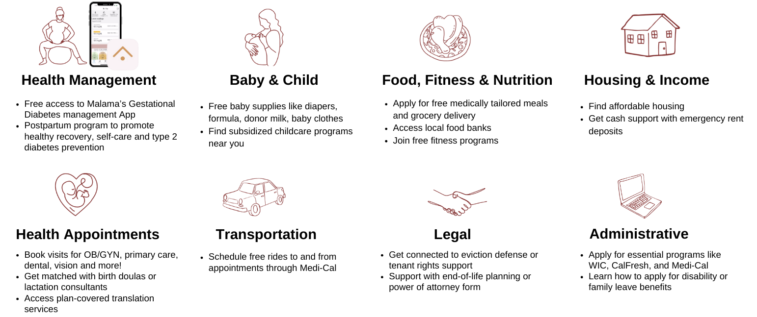 Beyond biometrics, Malama addresses the social and emotional needs that drive maternal health outcomes, at no cost to patients insured by Medicaid plans. Malama’s platform coordinates the following: